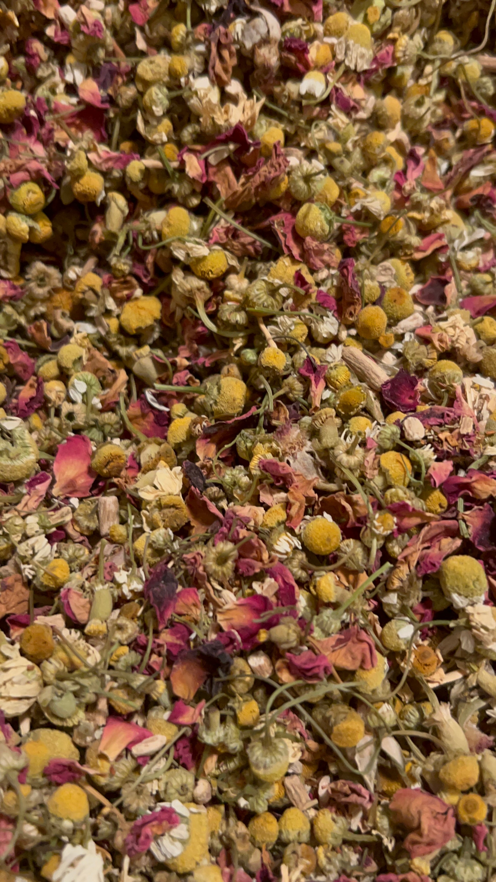 Chamomile, dried rose petals, ashwagandha, rooibos